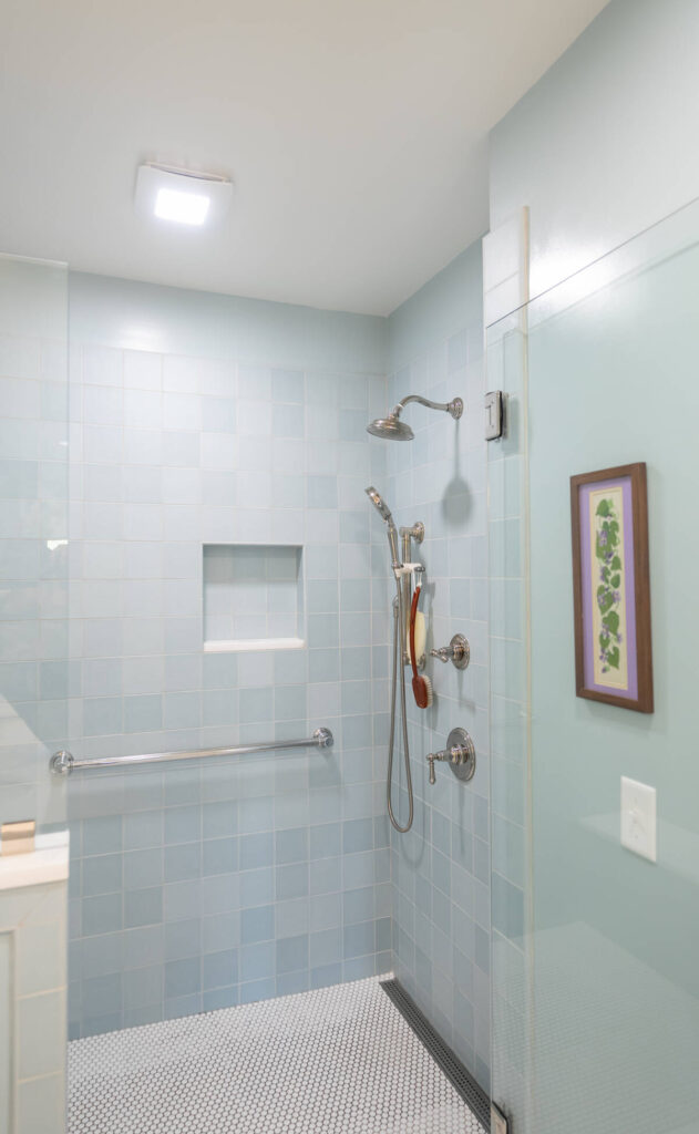 Special Details: A window above the dual sinks was closed up to allow for properly placed mirrors. Our experienced in-house carpenters opened up the shower wall, to expand the footprint for the space. The shower header was brought out to provide better ventilation. Custom vanity was built, new countertops and heated floors were installed.