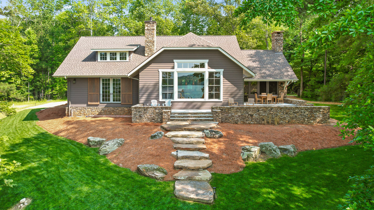 Special Details: Windows/doors from Sierra Pacific and Kolbe (sourced through Window Gallery) were created specifically for the home. This includes a custom 8′ x 8′ picture window precisely framed in the architectural plans to capture the breathtaking lake view. An electric-powered retractable screen door opens the primary bedroom to sweeping lake views. The extensive stonework flows throughout the exterior, skillfully crafted by Hidden Marble Masonry.